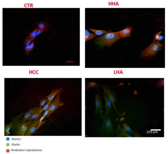 Expression of elastin in HaCaT/HDF co-cultures for a control and in the presence of HHA, LHA, and HCC. Images were taken after 24 h of treatment. The panels show triple immunofluorescence analysis for cytoskeleton (red), nucleus (blue), and elastin (green). In the presence of HCC, the expression of elastin was increased. Scale bar represents 100 μm.