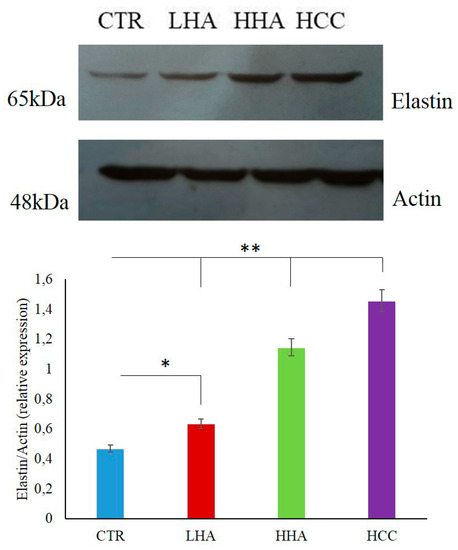 Effects of LHA, HHA, and HCC on elastin protein expressions in scratched HaCaT cells at 24 h in comparison with a control sample. Densitometry values are normalized with respect to actin. *p < 0.05 for LHA vs. ctr; **p < 0.01 for HHA and HCC vs. CTR.