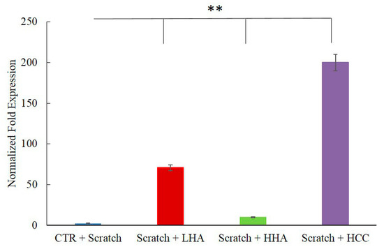 Up-regulation of MMP-9 occurred in the presence of HCC in a short time frame (4 h after treatment). At 24 h, the expression of MMP-9 decreased with HCC or HHA treatment compared to the control and LHA samples, confirming the faster wound closure in the presence of the first two treatments (Figure 7B).