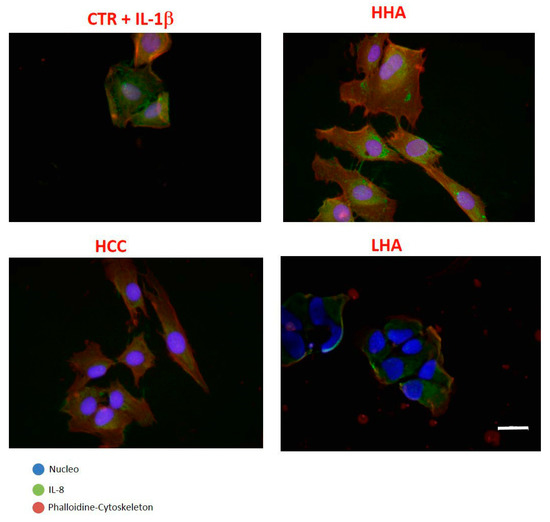 Expression of IL-8 in HaCat/HDF co-culture. Cells were stimulated with IL-1β for 2 h and then treated with HHA, LHA, and HCC at 0.4% w/w, as well as a control for comparison. Images were taken 24 h after treatment. The panels show triple immunofluorescence analysis for cytoskeleton (red), nucleus (blue), and interleukin (green). In the presence of HCCs, the expression of IL-8 decreased. Scale bar represents 100 μm.