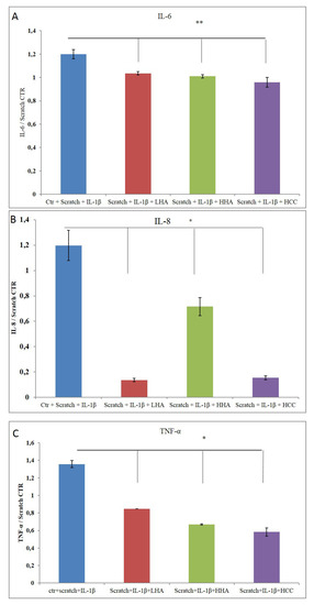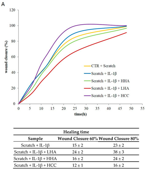 The statistical analysis was run on five measurements for each of the experimental conditions at specific wound repair areas (60% and 80%) as reported in Figure 6B. Specifically, LHA was slower than CTR in the repairing process, HHA was not significantly different from the IL-1β treated CTR, while HCC proved significantly faster than all the others (p < 0.05).