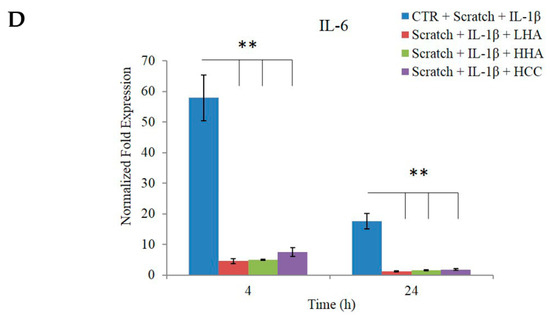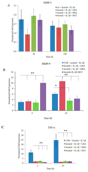 Concerning specific remodeling biomarkers, we found that IL-1β treatment alone already up-regulated MMP-2 expression by 1.5–2-fold at 4 h, and all the treatments, except for LHA, were in agreement with recently reported results [25]. At 24 h, all the treatments, except for LHA, presented a reduction of MMP-2 expression coherent with the accomplished wound closure. However, MMP-2 for LHA treatments was higher at 24 h than the one found at 4 h. In fact, LHA treatment allowed for only 60–70% closure in 24 h (Figure 7A).