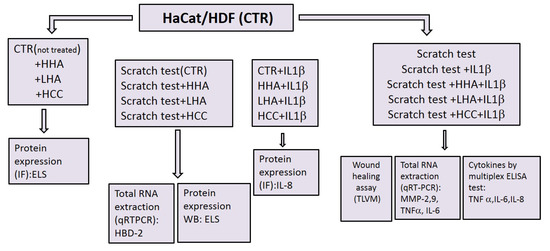 In the present study, a new in vitro model of wound healing based on a HaCaT/HDF monolayer culture was used to simulate the natural skin repairing conditions as much as possible. In addition, the presence of an inflammation agent (i.e., IL-1β) prompted an increase in cytokines at the gene and protein level, as expected, confirming a higher inflammation status with respect to scratching alone. However, this higher inflammation status did not correspond with a lower wound-healing rate. When only the HaCaT monolayer was scratched and subjected to treatment with IL-1β, the repair rate slowed with respect to scratching alone (data not shown). This different behavior is probably due to the presence of fibroblasts that, when treated with an inflammatory agent, lead to increased MMP levels, prompting matrix remodeling and the repair process itself [33].
