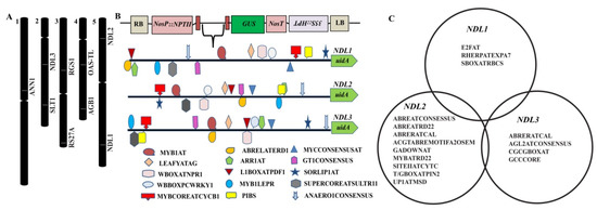Comparative analysis of the cis-elements present in the promoter sequences of all three NDL members was done using the PLANTPAN 2.0 software. In silico comparative analysis revealed presence of many common TFs binding sites. All three members showed presence of AtMYB2 and AtMYC2 binding sites which are already established characteristic of NDL gene family in animals and reason for their nomenclature [17,18]. Abiotic stress-responsive TFs that are involved in dehydration (MYB1AT and ABRELATERD1), sulfur-responsive (SURECOREATSULTR11), phosphate-responsive (PIBS) and SA-induced (WBOXATNPR1), cytokinin-responsive element (ARR1) and defense related TFs like MYB1LEPR binding motif are also present in all the three members of the family. Presence of all these common elements in all three NDL genes hints towards the common role of NDL family during abiotic and biotic responses. Light-induced TFs like GT1CONSENSUS and SORLIP1AT and developmental and cell cycle-responsive TFs like LEAFYATG and MYBCOREAYCYCB1 are also present in all three members indicating diverse role of NDL family members during various stages of plant growth and development (Figure 1B and Table 1).