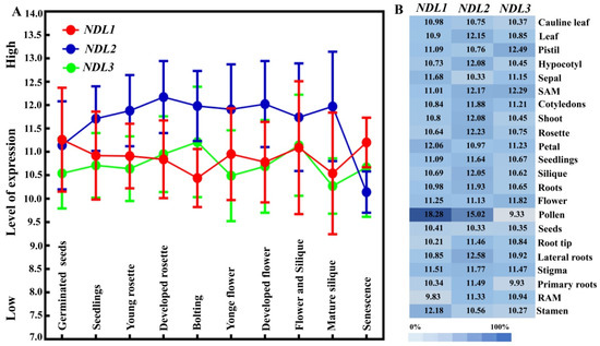 In silico expression analysis of NDL gene family. (A) GENEVESTIGATOR microarray expression analysis of NDL1, NDL2 and NDL3 during different developmental stages of plant growth. (B) In silico microarray analysis showing tissue-specific expression of NDL1, NDL2, and NDL3 using GENEVESTIGATOR.