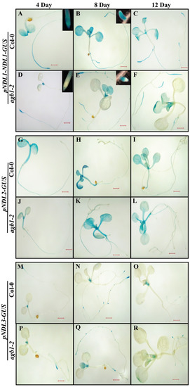 In agb1-2 background pNDL1-NDL1-GUS localization was absent from cotyledonary leaves (Figure 3D–F and Table 3) but present in true leaves. In case of roots the localization was absent from both primary and lateral roots RAM (Figure 3D,E inset) whereas present in other parts of roots similar to Col-0 background. In case of pNDL2-GUS and pNDL3-GUS localization pattern of the GUS was same in agb1-2 mutant background as compared to wild type Col-0. (Figure 3J–L for NDL2, Figure 3P–R for NDL3 and Table 3). These finding indicate that expression levels of both NDL2 and NDL3 are also unaffected by the absence of AGB1 similar to previously reported for NDL1.
