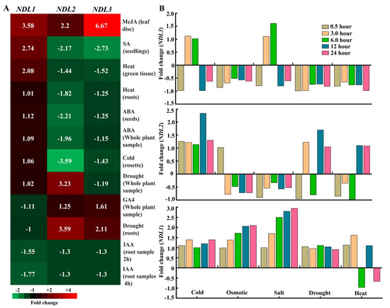In silico expression analysis of NDL gene family during abiotic stress and hormonal treatment using genevestigator and eFP browser: (A). Comparative in-silico expression analysis of NDL1, NDL2, and NDL3 using GENEVESTIGATOR microarray data, under different abiotic stress and hormonal treatments (B). In silico analysis of NDL1, NDL2, and NDL3 during abiotic stress treatments at different time points (0.5, 3, 6, 12, and 24 h) comparative expression is shown as fold change compared to no stress control.