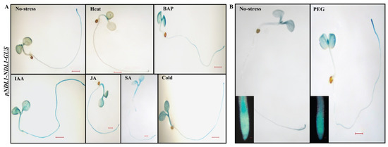 pNDL1-NDL1-GUS, showed increase in the GUS staining intensity when treated with cold, IAA (auxin), JA, Salicyclic acid (SA), BAP (cytokinin), and Poly ethylene glycol (PEG) and almost no staining observed with heat treatment (Figure 5). GUS staining remained unaffected after treatment with ABA (Supplementary Figure S2), GA (Supplementary Figure S3) and mannitol (Supplementary Figure S4). In case of salt treatment, no difference was found in root but hypocotyle showed increase in the GUS staining intensity (Supplementary Figure S5) compared to no stress treatment control.
