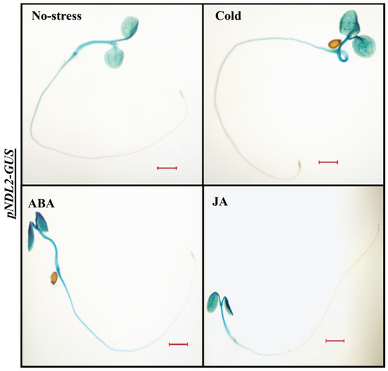 In vivo histochemical analysis of GUS activity for NDL2 in wild type Col-0 background in response to different abiotic stresses and hormones: Histochemical GUS staining of 6-D-old transgenic Arabidopsis seedlings (pNDL2-GUS) in wild type Col-0 background. Increased intensity levels of GUS staining detected with ABA, cold, and JA. Result shown is representative of three independent biological replicates (n ≥ 10 in each experiment). Scale Bar = 0.2 μM.