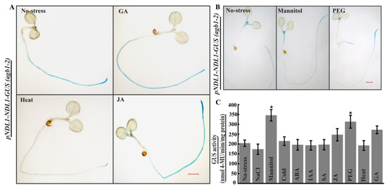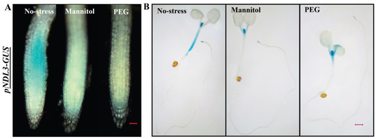 In case of pNDL3-GUS, no difference in the GUS staining was detected when seedlings were treated with ABA, BAP, cold (Supplementary Figure S2), IAA, GA, JA, heat (Supplementary Figure S3), salt and SA (Supplementary Figure S5). Mannitol and PEG treatment resulted in decreased level of pNDL3-GUS expression in RAM and hypocotyl in comparison to no treatment control which showed diminished staining at both the places. GUS staining was absent in the rest of the seedlings, same as in case of no treatment control of six-day old seedling (Figure 7 and Supplementary Figure S4).