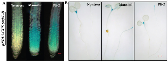 In vivo histochemical GUS staining of 6-day old transgenic Arabidopsis seedlings (pNDL3-GUS) in agb1-2 mutant background: (A). Increased levels of GUS staining intensity were detected in RAM compare to almost no staining in no treatment control with Mannitol and PEG treatment. (B) Histochemical GUS staining was analysed in whole seedling also. ne Six days old Arabidopsis transgenic seedlings were subjected to treatment for 24 h. Result shown is representative of three independent biological replicates (n ≥ 10 in each experiment). Scale Bar = 0.2 μM for seedlings and 0.02 μM for RAM.