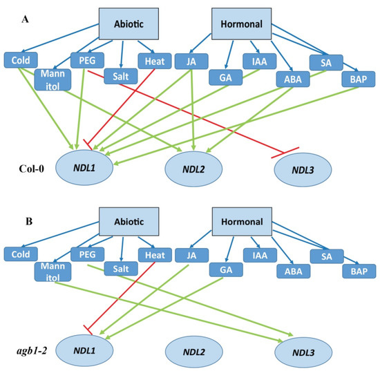 AtNDLs responses to various abiotic and hormonal treatments in presence and absence of AGB1: (A) Diagrammatic representation of AtNDLs in wild type background in response to various abiotic and hormonal treatments. (B) AtNDLs responses to various abiotic and hormonal treatments in agb1-2 mutant background. The green lines indicates that the gene was up regulated while the red lines indicates the downregulation of gene after the respective treatments.