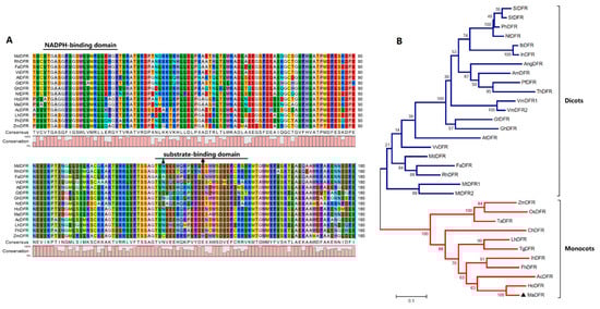 The full-length cDNA of MaDFR (GenBank accession no. MK937098) from grape hyacinth (M. aucheri, ‘Dark eyes’) is 1101 bp in length (Figure S1A,B) and encodes a protein of 366 amino acids (Figure S1C) and 40.93 kDa molecular weight. The deduced MaDFR amino acid sequence showed high similarity with the DFR proteins from Hyacinthus orientalis (87.19%), Iris × hollandica (67.65%), and Antirrhinum majus (48.65%) (Figure 1A). The multiple amino acid sequence alignment also revealed the highly conserved NADPH-binding motif (VTGAAGFIGSWLIMRLLERGY) [15] and the substrate-binding domain (T133–K158) [11] in the MaDFR sequence (Figure 1A). These results indicate that MaDFR can be classified into the short chain dehydrogenase/reductase (SDR) superfamily of proteins, which catalyze the reduction of three colorless dihydroflavonols to leucoanthocyanidins in the anthocyanin synthetic pathway.