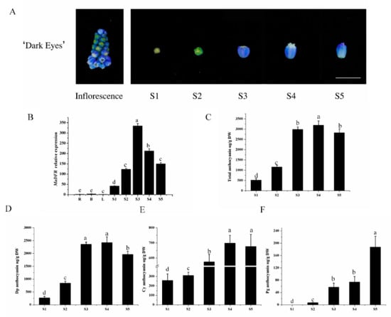 Anthocyanin content and MaDFR expression profiles in grape hyacinth. (A) The inflorescence and petals at five developmental stages. Flower development is divided into five stages: S1, newly formed flower buds with a little color; S2, development of petals with some color; S3, completely colored but closed petals; S4, completely colored and open petals; S5, flower senescence. Scale bars = 5 mm. (B) The expression profile of MaDFR, MaDFR expression in roots (R), bulbs (B), leaves (L) and flowers at five developmental stages. (C). Accumulation of total anthocyanins at five developmental stages in grape hyacinth. (D). Accumulation of delphinidin (Dp) at five developmental stages in grape hyacinth. (E). Accumulation of cyaniding (Cy) at five developmental stages in grape hyacinth. (F). Accumulation of pelargonidin Pg at five developmental stages in grape hyacinth. DW: Dry weight. Data represent the means ± SEs of three independent experiments.