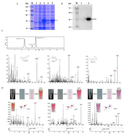 The Escherichia coli strain BL21 (DE3) was transformed with the empty pET28a-His vector, recombinant MaDFR, MaDFRa, MaDFRb, and MaDFRc. The transformants were incubated in Luria–Bertani (LB) medium overnight including 50 μg/mL kanamycin at 37 °C and 280 rpm agitation. On the next day, a 1:50 dilution of the culture was prepared in fresh LB medium containing 50 μg/mL kanamycin and incubated at 37 °C and 280 rpm agitation, until the optical density of the culture at 600 nm absorbance (OD600) reached a value of 0.8. To induce recombinant protein production, 0.2 mM of isopropyl-β-d-thiogalactopyranoside (IPTG) was added to the culture and incubated at 16 °C for 20 h. After induction, the cells were centrifugated at 12,000 rpm for 10 min to obtain the bacterial pellet, which was resuspended in phosphate-buffered saline (PBS; pH 7.4); next, it was disrupted using a Noise Isolating Chamber (Scientz, Ningbo, China) for 15 min, with an output power of 200 W. After that, the mixture was collected at 12,000 rpm for 20 min, and the supernatant containing crude proteins was collected. A quantity of 50 μL of crude proteins was used for SDS-PAGE and immunoblotting with a specific antibody against His (the antibody sequence for HHHHHH, TransGen Biotech, Beijing, China); the goat anti-mouse IgG (H+L) (TransGen Biotech, Beijing, China) was used to recognize the mouse monoclonal anti-His antibodies, and the antibodies were used following the instructions. The experimental operation was according to a method reported by predecessors [32].