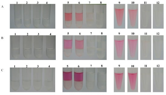 Enzyme assay of the MaDFRa, MaDFRb and MaDFRc proteins. (A). Enzymatic reaction process of the substrate DHK. 1, 2, 3 and 4; A 500 µL reaction mixture containing 70 µL (10 mM) Tris-HCl (pH 7.0), 50 µL (20 mM) NADPH, 10 µL DHK and 370 µL crude protein extract containing MaDFRa, MaDFRb, MaDFRc and the empty pET-28a, respectively, was incubated at 37 °C for 1 h. 5, 6, 7 and 8: An equal volume of n-butanol:HCl (95:5, v/v) was added, respectively, and then the reactions were incubated at 95 °C for 1 h to form anthocyanidins. 9, 10, 11 and 12: The n-butanol layer was evaporated using a stream of nitrogen gas and the residue was dissolved in 100 µL of methanol, respectively. (B). Enzymatic reaction process of the substrate DHQ. 1, 2, 3 and 4: A 500µL reaction mixture containing 70 µL (10 mM) Tris-HCl (pH 7.0), 50 µL (20 mM) NADPH, 10 µL DHQ and 370 µL crude protein extract containing MaDFRa, MaDFRb, MaDFRc and the empty pET-28a, respectively, was incubated at 37 °C for 1 h. 5, 6, 7 and 8: An equal volume of n-butanol:HCl (95:5, v/v) was added, respectively, the reactions was incubated at 95 °C for 1h to form anthocyanidins. 9, 10, 11 and 12: The n-butanol layer was evaporated using a stream of nitrogen gas, and the residue was dissolved in 100 µL of methanol, respectively. (C). Enzymatic reaction process of the substrate DHM. 1, 2, 3 and 4: A 500 µL reaction mixture containing 70 µL (10 mM) Tris-HCl (pH 7.0), 50 µL (20 mM) NADPH, 10 µL DHM and 370 µL crude protein extract containing MaDFRa, MaDFRb, MaDFRc and the empty pET-28a, respectively, was incubated at 37 °C for 1 h. 5, 6, 7 and 8: An equal volume of n-butanol:HCl (95:5, v/v) was added, respectively, and then the reactions were incubated at 95 °C for 1 h to form anthocyanidins. 9, 10, 11 and 12: The n-butanol layer was evaporated using a stream of nitrogen gas and the residue was dissolved in 100 µL of methanol, respectively.