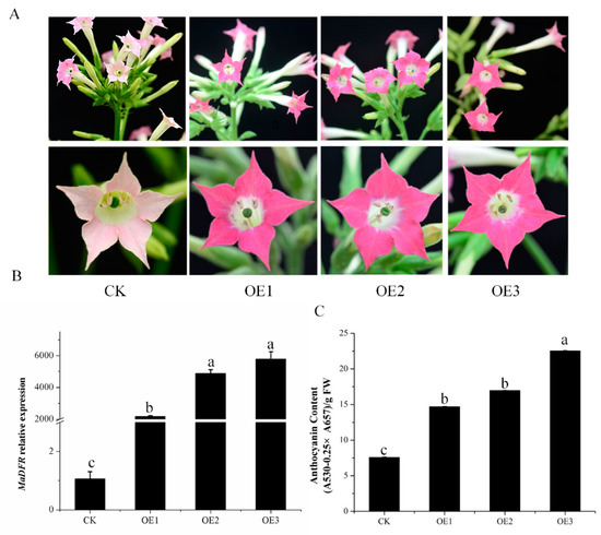 To investigate the function of MaDFR, a binary vector harboring the MaDFR gene under the control of the cauliflower mosaic virus 35S promoter was transformed in tabacum. We obtained 11 independent transgenic lines with different colored flowers by gene-specific PCR analysis and did not determine the copy number of T-DNA insertions in the chosen lines (data not shown). Three transgenic lines with dark red flowers were selected for further analysis. Compared with the control (CK) transgenic line (pale pink flowers) carrying the empty vector, the p35SMaDFR transgenic tobacco lines in the T3 generation showed more pigmentation (Figure 5A). The expression level of MaDFR in transgenic tobacco lines was confirmed by qPCR. The results show that the transcript levels in transgenic plants of MaDFR were higher than in the CK line (Figure 5B). Anthocyanins were extracted from the corollas of the three transgenic lines and quantified using as spectrophotometer. Results show that anthocyanin levels in the flowers of MaDFR overexpression line 3 (OE3) were three-fold higher than in CK (Figure 5C), indicating that the enzyme encoded by MaDFR effectively increased anthocyanin accumulation in vivo by interacting with the endogenous tobacco anthocyanin biosynthesis pathway enzymes.