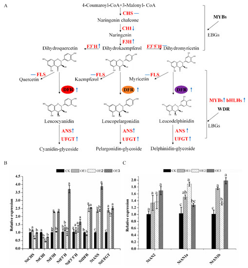 Schematic diagram of the flavonoid biosynthetic pathway leading to anthocyanins and expression profiles of anthocyanin biosynthetic endogenous genes in transgenic tobacco petals. (A). A schematic diagram of the flavonoid biosynthetic pathway, in which the dihydroflavonol reductase (DFR) catalyzes the NADPH-dependent reduction of dihydroflavonols to corresponding products. (B) Expression profiles of endogenous anthocyanin biosynthetic genes in petals of the CK line and MaDFR OE lines (OE1–3). Expression patterns in petals of the early biosynthetic genes (NtCHS, NtCHI, F3H, NtF3’H and NtF3’5’H) and the late biosynthetic genes (NtDFR, NtANS, and NtUFGT). (C) Expression patterns in petals of the regulatory genes (NtAN2, NtAN1a, and NtAN1b). Data represent means ± SEs of three independent experiments. Values which are not significantly different among samples are identified by the same letter (a–c). Abbreviations used are: CHS: chalcone synthase, CHI: chalconeisomerase, F3H: flavanone 3-hydroxylase, F3′H: flavonoid 3′-hydroxylase, F3′5′H: flavonoid 3′5′-hydroxylase, DFR: dihydroflavonol 4-reductase, ANS: anthocyanidin synthase, UFGT: anthocyanidin 3-O-glucosyltransferase, MYBs: MYB transcription factors, bHLHs: basic helix-loop-helix proteins, WDR: WD repeat protein, EBGs: early biosynthetic genes, LBGs: late biosynthetic genes. The analyzed genes are highlighted in red. The upward blue arrow represents the upregulation of the gene, the downward blue arrow represents the downregulation of the gene, and the horizontal blue line represents a slight change in gene expression.