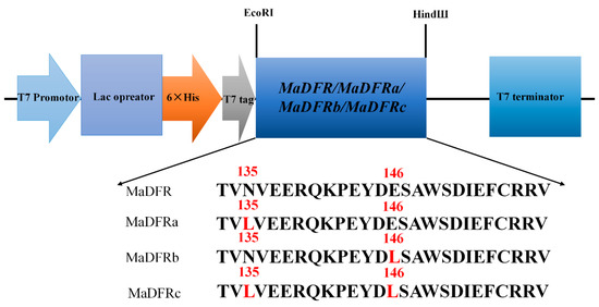 Mutant variants of the MaDFR genes (MaDFRa, MaDFRb, and MaDFRc), each containing a point mutation, were generated as described previously [11] (Figure 7). The wild-type MaDFR gene and all three mutant variants (MaDFRa, MaDFRb, and MaDFRc) were subcloned into the pET28a-His vector separately, the location of the His tag is at the C-terminal of the pET28a-His vector. Primers used for vector construction are listed in Table S1.