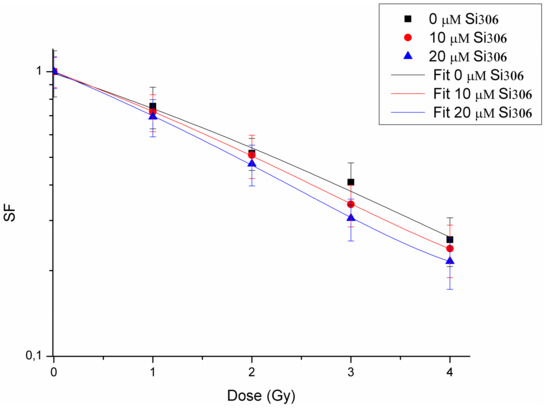 The SF data versus dose were plotted with the reported quadratic equation: where y is ln(SF) and x is the dose, considering the positive solution. The experimental samples (pretreated with 10 or 20 µM of Si306 and proton irradiated) were normalized to coefficient of the previous equation in order to start the survival curves from the same origin. The results were achieved with the software OriginPro 8.