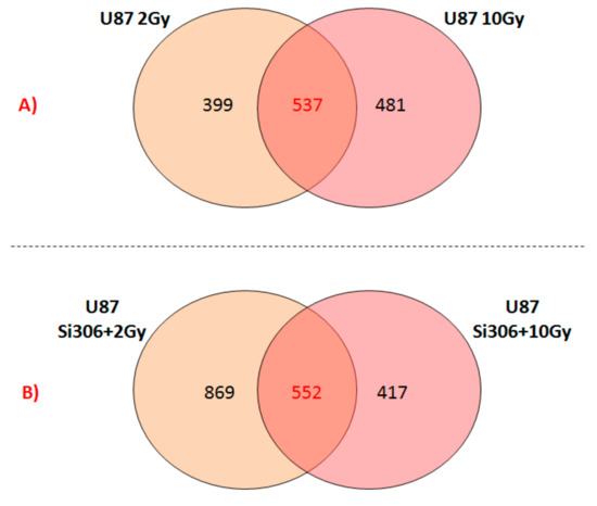 To study molecular pathways and cell networks activated at transcriptional level in U87 cells exposed to PT, with or without Si306 compound, we performed gene expression experiments by cDNA microarray. In particular, in this work we analyzed GEP of the following configurations: (i) U87 2 Gy versus U87 untreated cells; (ii) U87 10 Gy versus U87 untreated cells; (iii) U87 2 Gy + 10 µM Si306 versus U87 2 Gy; and iv) U87 10 Gy + 10 µM Si306 versus U87 10 Gy.