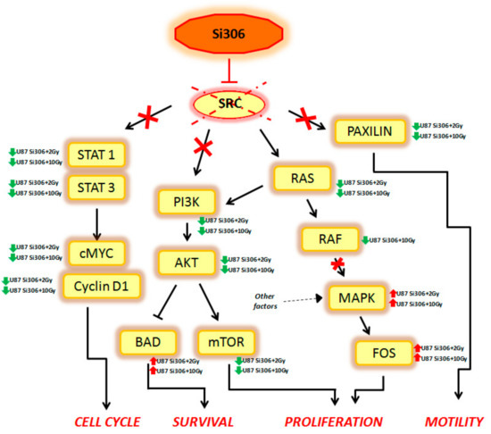 In particular, the STAT1, STAT3, c-MYC, and Cyclin D1 genes, which are able to control the cell cycle, were downregulated in our analysis. Cell survival was negatively regulated by the downstream PI3K, AKT, and mTOR downregulation and by the BAD upregulation. In addition, Si306 is able to cause a partial inhibition of cell proliferation, downregulating RAS and RAF gene expression. However, the MAPK and FOS genes were not targets of Si306, so these factors (up regulated in our data), were probably activated by other cellular pathways. Finally, Si306 is also able to negatively regulate cell motility, through the downregulation of the paxilin gene.