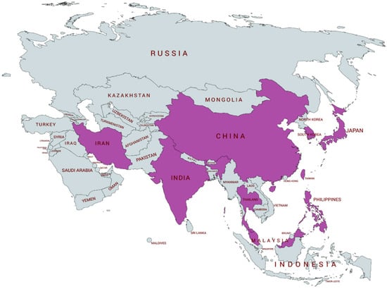 Distribution of APP, PSEN1, and PSEN2 mutations in Asian countries. The fastest increase in the number of elderly individuals has been observed in Asian countries with approximately 60% of all patients diagnosed with dementia. The countries from which the gene mutations are reported are shown in purple.