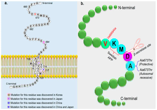 (a) Mutated APP residues identified in Asian countries are shown in different colors. (b) Location of Val669Leu in APP and mutations located near the β-secretase cleavage site. The nearest mutation is the “Swedish APP” mutation. Additional mutations located near the β-secretase cleavage site are the protective Ala673Thr and the pathogenic Ala673Val.