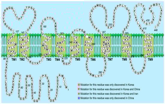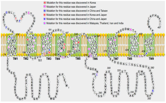Mutated PSEN1 residues identified in the Asian countries are shown in different colors. The predicted membrane topology of PSEN1 with the nine transmembrane domains (green shaded boxes) and boundaries between coding exons is shown. TM, transmembrane domain.