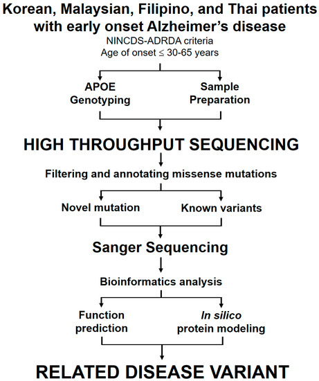 Genetic analyses were performed on DNA extracted from whole blood. Sanger sequencing, next-generation sequencing (NGS) and whole exon sequencing (WES) were employed to search for mutations in the APP, PSEN1, and PSEN2 genes in patients with both sporadic and family history of AD. APOE genotypes comprising the APOE ε2, ε3, and ε4 alleles were assayed [15]. To confirm the presence of the identified mutations, standard sequencing was performed in both directions using the previously used primer set [1,2]. Prior to sequencing, PCR products were purified using the GeneAll PCR protocol kit (Seoul, Korea), following the manufacturer’s protocol. Big Dye Terminator Cyclic sequencing was performed on an ABI 3730XL DNA Analyzer (http://eng.bioneer.com/home.aspx, Bioneer Inc., Dajeon, Korea). The sequenced product was aligned using the NCBI Blast tool (http://blast.ncbi.nlm.nih.gov/Blast.cgi), and chromatograms were screened using the DNA BASER (http://www.dnabaser.com). Mutations and sequence variants were identified from the NCBI Gene (http://www.ncbi.nlm.nih.gov/gene) and UniProt (http://www.uniprot.org) databases. Briefly, patients with EOAD were analyzed by high-throughput sequencing, following the schematic diagram shown in Figure 5.