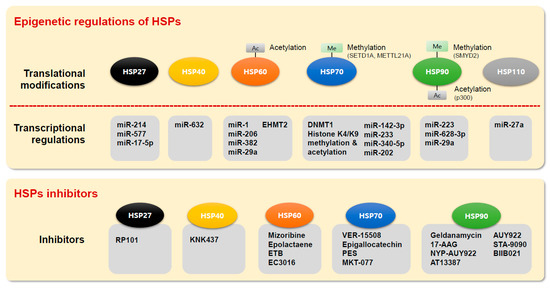 Heat shock proteins (HSPs) are conserved molecular chaperones that are divided into small HSPs, including HSP40, HSP60, HSP70, HSP90, and HSP110, according to their molecular weight [1,2,3]. In cells, HSPs inhibit misfolded proteins in response to cellular stress, such as high temperature and hypoxia [4]. HSPs are also associated with the apoptotic machinery via caspase-dependent or caspase-independent pathways and the immune response because they are expressed on the cell surface [5]. Recently, several studies have reported that HSP expression is maintained at high levels in cancer (due to overproduction of oncoproteins, hypoxia, and genomic instability) and that HSPs are critically involved in cancer cell proliferation, metastasis, invasion, and angiogenesis [3,6,7]. Thus, HSPs are recognized as therapeutic and diagnostic targets for cancer treatment. To regulate HSP expression, various regulatory proteins participate in the transcription and translation of HSPs. Among these proteins, proteins involved in the epigenetic machinery (involving histone modifications as well as miRNA and DNA methylation) are important regulators of gene expression. Additionally, in cancer, epigenetic modifiers are overexpressed and associated with the regulation of oncogenes, tumor suppressor genes, and HSPs by epigenetic regulation (e.g., hypo/hypermethylation in DNA, mRNA degradation by miRNA, and euchromatin/heterochromatin in histones) [8,9,10,11,12,13,14,15].