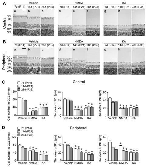 Changes in overall retinal morphology in rats intravitreally injected with NMDA or KA. (A,B) Representative photomicrographs of retinal cross-sections stained with hematoxylin and eosin obtained 7 (P14), 14 (P21), and 28 days (P35) following intravitreal injection of vehicle, NMDA (200 nmol) or KA (20 nmol) on P7. Scale bar = 50 μm in panel a (applies to b–i). (C,D) Quantification of the number of cells in GCL and the thicknesses of IPL and INL in central (C) and peripheral (D) retinal areas. The number of cells in GCL was expressed per length of retina (in millimetres). * p < 0.05 vs. the corresponding age-matched control value (vehicle). n = 4–5.