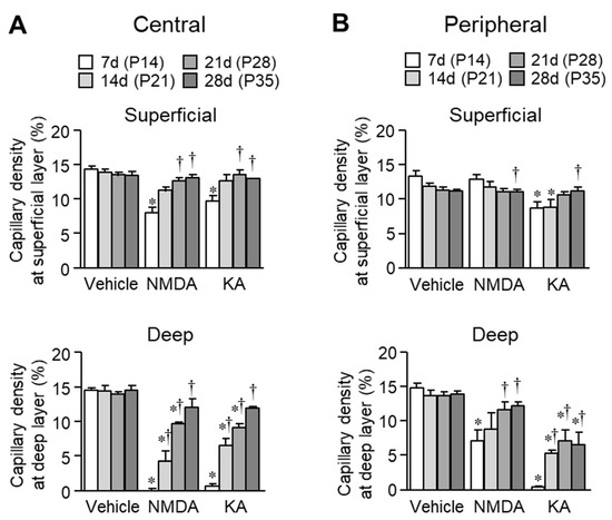 The quantitative data are summarized in Figure 4. In the central retina, capillary densities were significantly reduced at both the superficial and deep vascular plexuses seven days (on P14) after intravitreal injection of NMDA or KA, compared with the age-matched vehicle-treated eyes (Figure 4A). Thereafter, capillary densities increased in a time-dependent manner and reached normal levels 28 days (on P35) after the injection. In contrast, no reduction in capillary density at the superficial layer in the peripheral area was observed seven days (on P14) after the NMDA injection (Figure 4B). At the deep layer, capillary density decreased seven days (on P14) after intravitreal injection of NMDA or KA, but thereafter increased; however, the values did not reach the normal range. Thus, changes in vasculature were larger in the central retina than in the peripheral retina in NMDA-treated eyes. Such a region-difference was not observed in the retinas of KA-treated eyes.