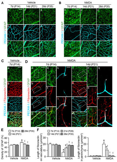 Marked capillary regression was detected in the retinas of NMDA-treated eyes. Therefore, detailed and careful analyses of re-vascularization were performed in NMDA-treated eyes. We first examined the changes in the distribution of astrocytes, one of the retinal glial cells, because the glial cells play an important role in the development and maintenance of vasculature in the retina [21,27]. Double labeling with glial fibrillary acidic protein (GFAP; an astrocyte marker) and platelet endothelial cell adhesion molecule (PECAM-1; an endothelial cell marker) revealed that in the retinas of vehicle-treated eyes, GFAP-positive astrocytes had typical star shapes with several processes; some processes from astrocytes extended toward the vessels, and the end-feet of glial processes contacted and enveloped the vasculature (Figure 5A). Seven days after intravitreal injection of NMDA (on P14), morphological changes in astrocytes occurred and the area density of GFAP was increased (Figure 5Ba and E). These changes in astrocytes were later returned to almost normal levels (Figure 5Bd, Bg, and E).
