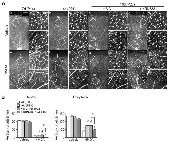 Effects of pharmacological blockade of VEGF signaling pathway on angiogenesis and re-vascularization in retinas of rats intravitreally injected with vehicle or NMDA. (A) Fluorescence photomicrographs of retinal whole-mounts stained for endothelial cells (RECA) obtained 7 (P14), 14 (P21), and 16 days (P23) following intravitreal injection of vehicle or NMDA (200 nmol) on P7. The animals were injected with KRN633 or the vehicle (0.5% methylcellulose; MC) on P21 and P22. Higher-magnification images of the insets are shown in the panels Aa1–h1 and Aa2–h2. Arrowheads indicate vertical sprouts. Scale bars = 500 µm in Aa (applies to b–h) and 150 µm in Aa1 (applies to b1–h1 and a2–h2). (B) Quantification of the number of vertical sprouts in central and peripheral retinal areas. * p < 0.05 vs. the corresponding age-matched control value (vehicle or vehicle + MC). † p < 0.05 vs. the corresponding seven days value after the injection. # p < 0.05. n = 4.