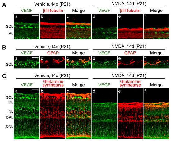 Colocalization of VEGF and cell type-specific markers in retinas of rats intravitreally injected with vehicle or NMDA. Cryosections stained with anti-VEGF antibody (green) plus one of the indicated cell-specific antibodies (red) obtained 14 days (P21) following intravitreal injection of vehicle or NMDA. (A) βIII-tubulin; (B) GFAP; (C) Glutamine synthetase. Scale bar = 150 µm in a (applies to b–f).