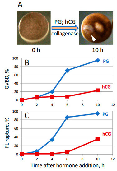 2.1. PG and Gonadotropin Induce In Vitro Oocyte Maturation without Follicle Rupture