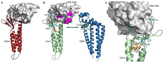 Homology model of the Cldn1-cCPE-SSS complex was built based on the Cldn4-cCPE complex (PDB ID: 5B2G; [43]). All manipulations, optimizations of the models, as well as calculations of hydrophobic and electrostatic potentials on the molecular surfaces, were performed with Sybyl X2.1.1 (Certara USA Inc., St. Louis, MO, USA). Models were energetically minimized using the AMBER7 FF99 force field. Structure images were generated with PyMOL Molecular Graphics System 1.8.4.1 (Schrödinger LLC, 2017).