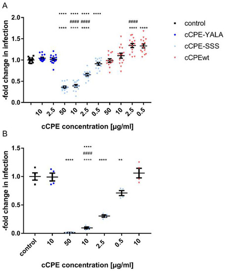 The inhibitory effect of cCPE-SSS on HCV infection was even more pronounced after extension of HCV incubation of the cells from 2 h to 26 h. Under these conditions, 10 µg/mL cCPE-SSS reduced the amount of HCV-infected cells to 0.095 ± 0.016-fold of the cells which were infected in the non-treated control. In contrast, at this concentration, neither cCPEwt nor cCPE-YALA had a significant effect (Figure 3B). Furthermore, 50 µg/mL cCPE-SSS inhibited the infection of HCV almost completely (0.013 ± 0.002-fold compared to the untreated control).