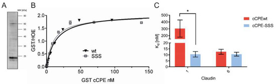 (A) Detection of Cldn6 expression in Huh7.5 cells by Western Blot. Huh7.5 cell pellets were lysed, the membrane protein fraction extracted, separated by SDS-PAGE and analyzed by Western blot using anti-Cldn6 antibodies. Cldn6 immunoreactive bands were observed in the expected range (18 kDa). (B) cCPEwt and cCPE–SSS bind with similar affinities to Cldn6 on the cell surface. Binding of GST-cCPEwt and –cCPE-SSS to Cldn6. HEK-293 cells were transfected with Cldn6. Binding of GST-cCPE variants was analyzed using a cellular binding assay with varying cCPE concentrations, fixation, staining with phycoerythrin-coupled anti-GST antibody and Hoechst 33342 (nuclei) for normalization. (C) cCPE-SSS binds with similar high affinities to Cldn1 and -6, whereas cCPEwt has a very low affinity for Cldn1. The derived respective affinities of cCPEwt and cCPE–SSS for Cldn6 are not significantly different, but cCPE-SSS binds with a significantly stronger affinity to Cldn1 than cCPEwt does. Dissociation constants (Kd) were calculated from the binding assays using a non-linear regression analysis in GraphPad Prism 6 (model: Saturation binding, equation: one site—specific binding) [6]. Results are shown as means SEM. Student’s t-Test, data from 3 (Cldn1) and 5 to 6 (Cldn6) independent Kd calculation experiments, *, p < 0.05.