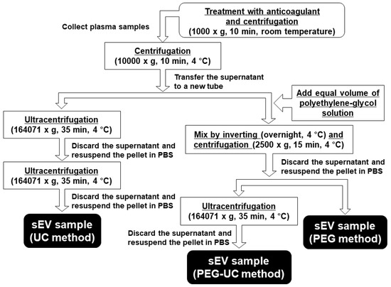 The overview of isolation procedures was described in a graphical scheme (Figure 1). Plasma samples were thawed at 37 °C and centrifuged (10,000× g, 10 min, 4 °C) to eliminate large EVs by using the microcentrifuge. The supernatant was divided equally into three groups, including the UC method, PEG-UC method, or PEG method. The UC method was performed as previously described [8]. Briefly, the supernatant was ultracentrifuged (164,071× g, 35 min, 4 °C) by using an Optima XL-80K ultracentrifuge with a swing rotor SW 55 Ti (Beckman Coulter Inc., Miami, FL, USA). The pellet was resuspended in phosphate-buffered saline (PBS, Sigma-Aldrich) and ultracentrifuged again. Then, the pellet was resuspended again in PBS, which was used for the following analysis. The PEG-UC and PEG methods were performed as described in the previous report [15]. In the PEG-UC method, the large EV-depleted supernatant was mixed with an equal volume of polyethylene-glycol solution consisting of 16% polyethylene-glycol (MW = 6000, FUJIFILM Wako Pure Chemical) and 1 M NaCl (Nacalai Tesque, Kyoto, Japan) by inverting (overnight, 4 °C). The mixture was then centrifuged (2500× g, 15 min, 4 °C), and the supernatant was discarded. The pellet was resuspended in PBS by vigorous vortex (30 min, room temperature) and ultracentrifuged (164,071× g, 35 min, 4 °C). The pellet was resuspended again in PBS, which was used for the following examination. In the PEG method, the large EV-depleted supernatant was mixed with an equal volume of polyethylene-glycol solution by inverting (overnight, 4 °C) and centrifuged (2500× g, 15 min, 4 °C). The pellet was resuspended in PBS by vigorous vortex (30 min, room temperature), which was used for the following examination.