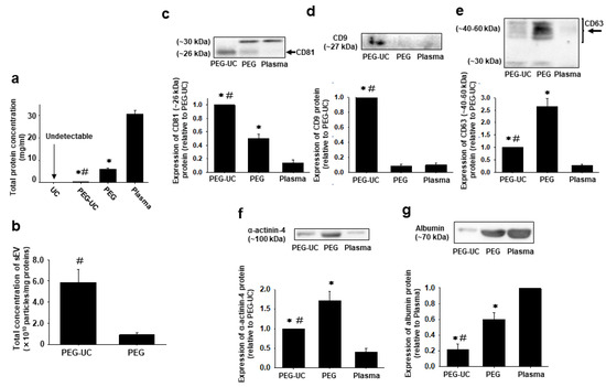 Total protein concentration and expression of marker proteins for sEVs (CD81, CD9, and CD63), large EVs (α-actinin-4), or plasma (albumin) in sEVs isolated by the different methods as described in Figure 1. Total protein was extracted from plasma sEVs of male Wistar rats (7–9-week-old) using radio-immunoprecipitation assay (RIPA) buffer. (a) The concentration of proteins was measured by a bicinchoninic acid (BCA) assay and normalized to the starting volume of plasma (mg/mL). (b) The total concentration of plasma sEVs normalized to each protein concentration was shown (particles/mg). (c–g) Expression of marker proteins in plasma sEVs was determined by Western blotting using an antibody to CD81, CD9, CD63, α-actinin-4, or albumin. The arrows indicated the bands for CD81 (c) and CD63 (e) that we measured for quantitative analyses. Data were shown as fold increase relative to the expression level in sEVs isolated by the PEG-UC method (c: CD81, d: CD9, e: CD63, f: α-actinin-4) or plasma (g: albumin). Results were expressed as means ± SEM in bar graphs (n = 4). Uncropped images are shown in Supplementary Figure S2. * p < 0.05 vs. plasma, # p < 0.05 vs. PEG.