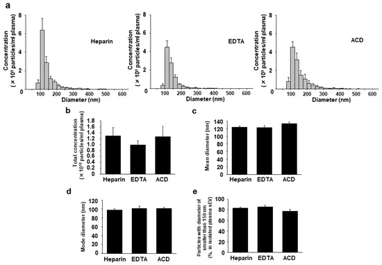 There was no significant difference in total concentration, mean diameter, mode diameter, or percentage of particles with a diameter of smaller than 150 nm in plasma sEVs among the three different anticoagulants (Figure 4b–e, n = 4).