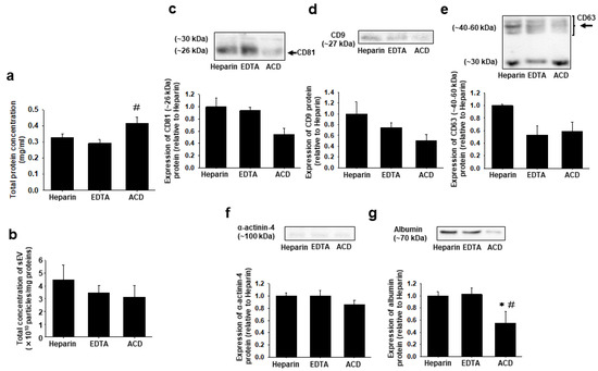 Effects of anticoagulants on total protein concentration and expression of marker proteins for sEVs, large EV, or plasma in sEVs. Total protein was extracted from sEVs isolated from heparin (1 U/mL)-, EDTA (1 mg/mL)-, or ACD (13%)-anticoagulated plasma in Wistar rats (5–10-week-old) by the PEG-UC method using RIPA buffer. (a) The concentration of proteins was measured by a BCA assay and normalized to the starting volume of plasma (mg/mL). (b) The total concentration of plasma sEVs normalized to each protein concentration was shown (particles/mg). (c–g) Expression of marker proteins was determined by Western blotting using antibody to CD81, CD9, CD63, α-actinin-4, or albumin. The arrows indicated the bands for CD81 (c) and CD63 (e) that we measured for quantitative analyses. Data were shown as fold increase relative to the expression level in sEVs derived from the heparin-anticoagulated plasma. Results were expressed as means ± SEM in bar graphs (n = 4). Uncropped images are shown in Supplementary Figure S3. * p < 0.05 vs. heparin, # p < 0.05 vs. EDTA.