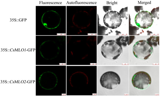 A sequence analysis indicated that the proteins encoded by CsMLO1 and CsMLO2 were transmembrane proteins with seven transmembrane structures (Figure S5). To confirm this prediction, we determined the subcellular localizations of the CsMLO1 and CsMLO2 proteins, and confocal imaging showed that CsMLO1-GFP and CsMLO2-GFP fluorescence were localized in the plasma membrane, whereas the GFP protein was found in multiple subcellular compartments, including the cell membrane, cytoplasm, and nucleus (Figure 1).