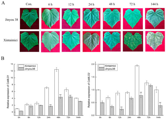 The phenotype and expression patterns of CsMLO in Jinyou38 and Xintaimici cultivars were inoculated with C. cassiicola. (A) Symptoms analysis in leaves of Jinyou 38 and Xintaimici cultivars after C. cassiicola challenge. (B) The transcript levels of CsMLO1 and CsMLO2 are shown in Jinyou 38 and Xintaimici cultivars after inoculation of C. cassiicola. Expression analysis of candidate genes at 0, 6, 12, 24, 48, 72 and 144 hpi (hours post-inoculation) using the 2−ΔΔCt method. Data are means (± standard deviation (SD)) of three biological replicates per cultivars. The asterisks indicated a significant difference (Student’s t-test, *P < 0.05 or **P < 0.01). Jinyou38 = high-resistant cultivar. Xintaimici = susceptible cultivar.