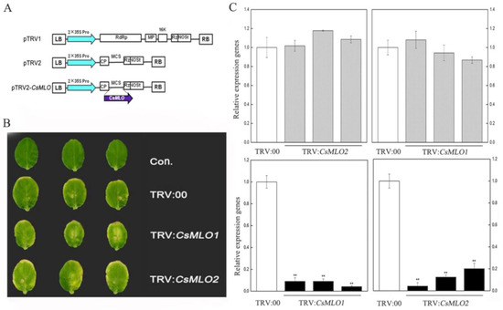 The induced Agrobacterium tumefaciens EHA105 strains carrying different pTRV2-derived vectors (pTRV2, pTRV2-CsMLO1 and pTRV2-CsMLO2) were mixed with the pTRV1 A. tumefaciens strain EHA105. The ratio was 1:1. The samples were supplemented with 10 mmol·L−1 MES, 10 mmol·L−1 MgCl2, and 200 μmol·L−1 acetosyringone (AS) and then coinfiltrated into fully expanded cotyledons of cucumber plants (OD600 = 0.4 for each construct). Plants were placed in a growth room at 22 °C with a 16 h light and 8 h dark photoperiod for growth [46].
