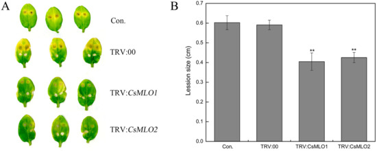 To determine whether a loss-of-function of CsMLO1 and CsMLO2 affected cucumber resistance to C. cassiicola, we used tobacco rattle virus (TRV)-based virus-induced gene silencing (VIGS) to silence CsMLO1/CsMLO2 transcripts in the susceptible cultivar Xintaimici. A 3′-terminal fragment specific to CsMLO1/CsMLO2 was inserted in the vector pTRV2, the pTRV2-CsMLO1/CsMLO2 recombinant plasmids (Figure 3A). Subsequently, TRV:CsMLO1 or TRV:CsMLO2 virus was injected in cucumber cotyledons. The chlorotic mosaic symptoms of TRV:00, TRV:CsMLO1, TRV:CsMLO2 emerged in the cotyledons of transgenic cucumber plants, while no symptoms appeared in the non-injected cucumber cotyledons, suggesting that TRV successfully invaded the cucumber plants (Figure 3B). Simultaneously, efficient silencing of CsMLO1 and CsMLO2 was confirmed by RT-qPCR (Figure 3C). In addition, to test whether the CsMLO2 gene was also silenced in CsMLO1-silenced cucumber plants, we detected CsMLO2 expression and observed no silencing by RT-qPCR. Similarly, we detected CsMLO1 expression in CsMLO2-silenced cucumber cotyledon. These results indicated that expression was almost abolished in CsMLO1-silenced and CsMLO2-silenced cucumbers.