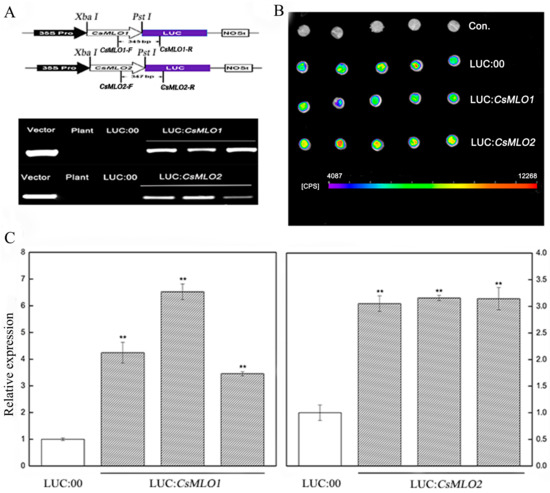 The full-length CsMLO1 and CsMLO2 cDNA sequences were constructed using the pCAMBIA 3301 vector with luciferase (LUC), and they were under the control of the CaMV 35S promoter in cotyledons of cucumbers. The gene-specific primers are listed in Table S3. The correct constructs were introduced into the A. tumefaciens strain EHA 105. Agrobacterium-meditated transformation with the LUC:00, LUC:CsMLO1 gene and LUC:CsMLO2 gene was carried out. The experimental method was the same as the above.