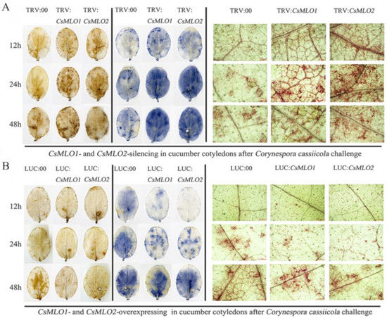 Based on the previous analysis, we speculated that the gene expression of CsMLO1 and CsMLO2 was related to ROS. Detached leaves from the transient overexpression and silenced plants subjected to C. cassiicola were used to measure the accumulation of H2O2 and O2·− using the 3,3′-diaminobenzidine (DAB) and nitrotetrazolium (NBT) staining methods, respectively (Figure 7). DAB staining showed that brown spots began to appear in CsMLO1/CsMLO2-silenced plants at 12 hpi (hours post-inoculation), which indicated that H2O2 began to accumulate compared to that in TRV:00 plants. At 24 and 48 hpi, a large area in the leaves was stained, showing that the leaves accumulated high levels of H2O2, which began to weakly decrease at 48 hpi (Figure 7A). However, at 24 hpi, brown spots began to appear in the CsMLO1/CsMLO2-overexpressing plants compared to the silenced plants (Figure 7B). At 48 hpi, deeply colored leaves and H2O2 accumulation were observed in CsMLO1/CsMLO2-overexpressing plants (Figure 7B). In the NBT staining experiment, blue spots began to appear at 12 hpi and large areas of blue began to appear in CsMLO1/CsMLO2-silenced plants at 24 and 48 hpi, whereas the O2·− accumulation began to weakly decrease at 48 hpi compared with 24 hpi (Figure 7A). However, blue spots began to appear at 24 hpi, and large areas of blue began to appear in CsMLO1/CsMLO2-overexpressing plants at 48 hpi (Figure 7B). Thus, outbreaks of ROS in silenced plants appeared earlier than those of the transient overexpression plants following C. cassiicola challenge, suggesting that the silencing of CsMLO1/CsMLO2 inhibited pathogen invasion or effectively initiated the defense responses. Moreover, histochemical staining of detached leaves at different treatment times showed lignin deposition (Figure 7). The accumulation of lignin was observed in CsMLO1/CsMLO2-silenced plants at 12, 24 and 48 h of C. cassiicola challenge (Figure 7A). Maximum lignin deposition was found in CsMLO1/CsMLO2-overexpressing cucumber cotyledons at 48 h following C. cassiicola challenge (Figure 7B). Similarly, silenced plants with C. cassiicola infection showed lignin deposition, and this change appeared earlier than that in the transient overexpression plants. We speculated that the strengthening of the cell wall in silenced plants following infection enhanced resistance and prevented pathogen invasion earlier than that in transient overexpression plants.